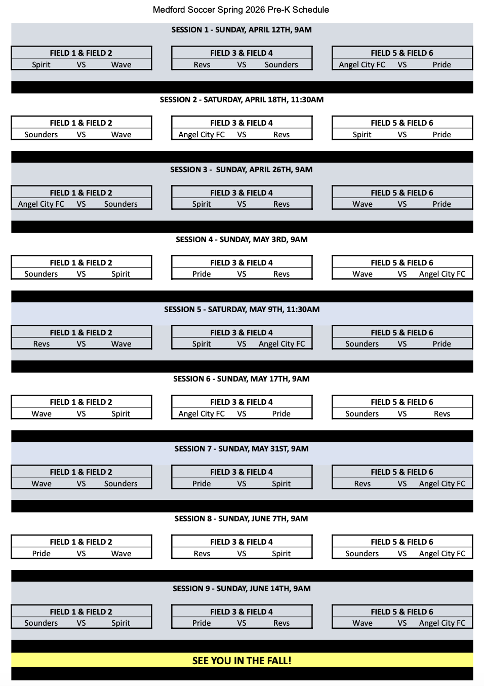Spring 2026 Pre-K ScheduleCLICK LINK FOR PDF OF SCHEDULE Pre-K plays on Sundays at 9am-10amAll sessions will be played behind Andrews Middle SchoolSeason will begin on Sunday, April 12thFinal session is on Sunday, June 14th